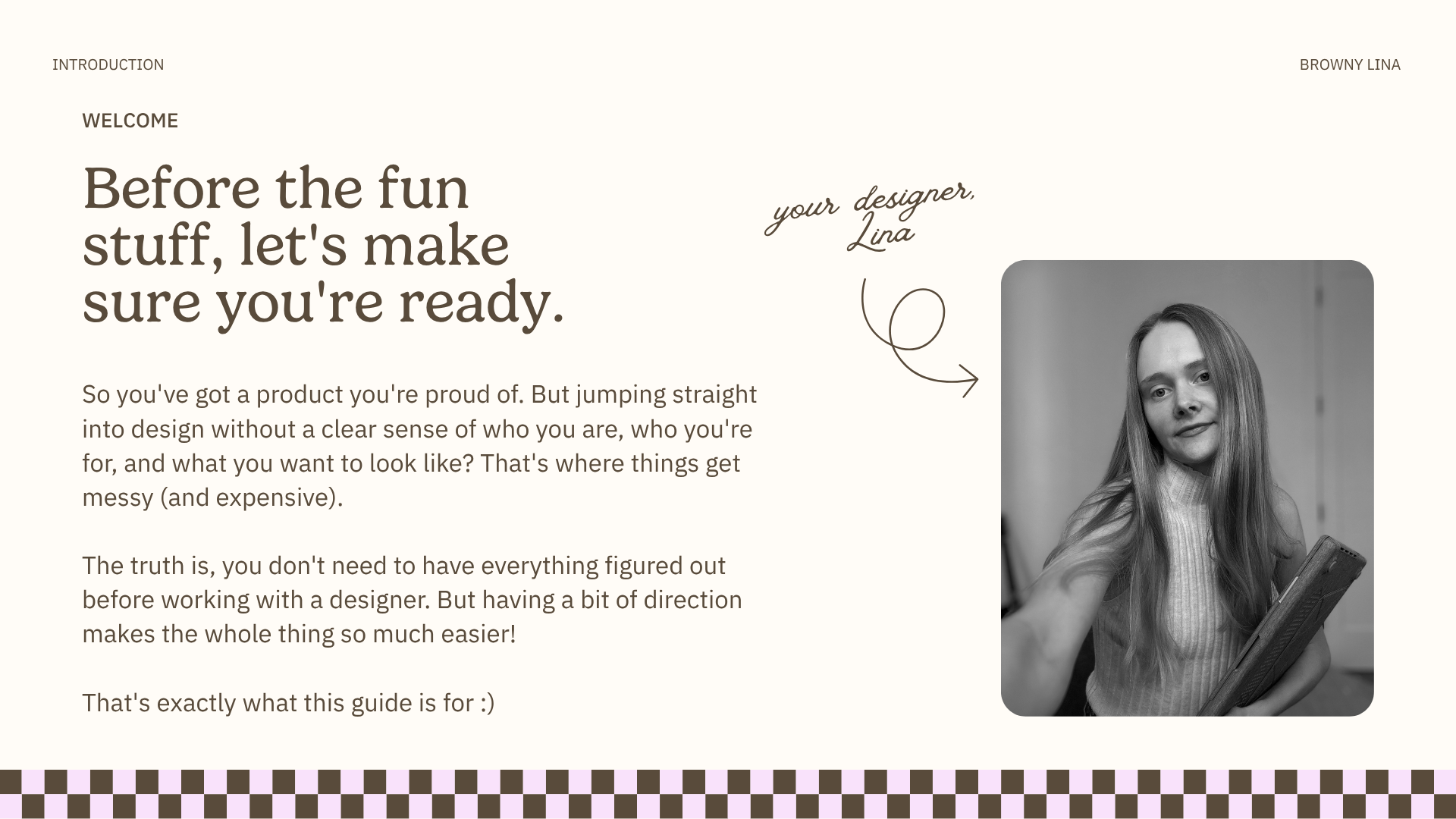 The more context, the better. A few words on your vibe, your target audience, and any inspiration you love. No need to have it all figured out, though; that's what the discovery call is for.